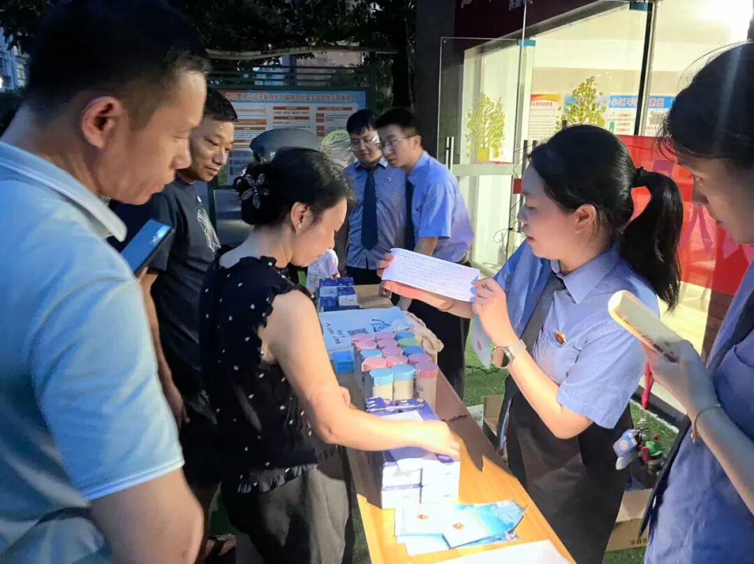 晚上7点,在万象广场一抹醒目的 “检察蓝” 格外引人注目 —— 这是县人民检察院开设的 “法治小铺”。身着检察制服的 “摊主” 们热情地向过往群众递发法律宣传手册,用通俗易懂的语言结合真实案例,细致解读《民法典》中与百姓生活息息相关的条款、反电诈领域的常见陷阱与防范技巧,耐心俯身解答群众提出的各类法律疑问。这种新颖独特、内容丰富且贴近生活的普法形式,不仅吸引了大量群众驻足参与,更赢得了大家的广泛好评。